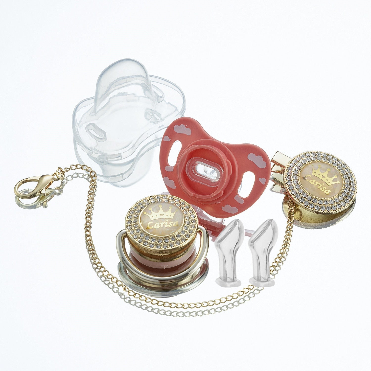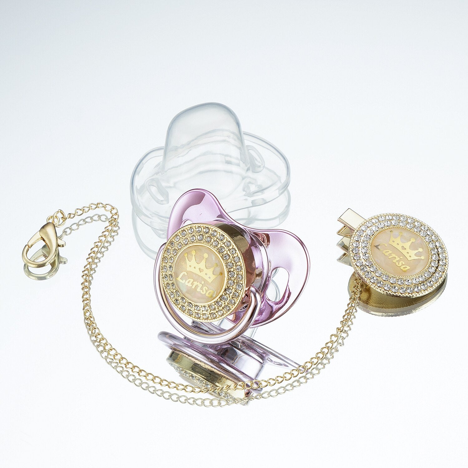 HIGH QUALITY – Pacifier and Clip are handcrafted with crystal rhinestones. The Pacifier clip will attach to all standard pacifiers.